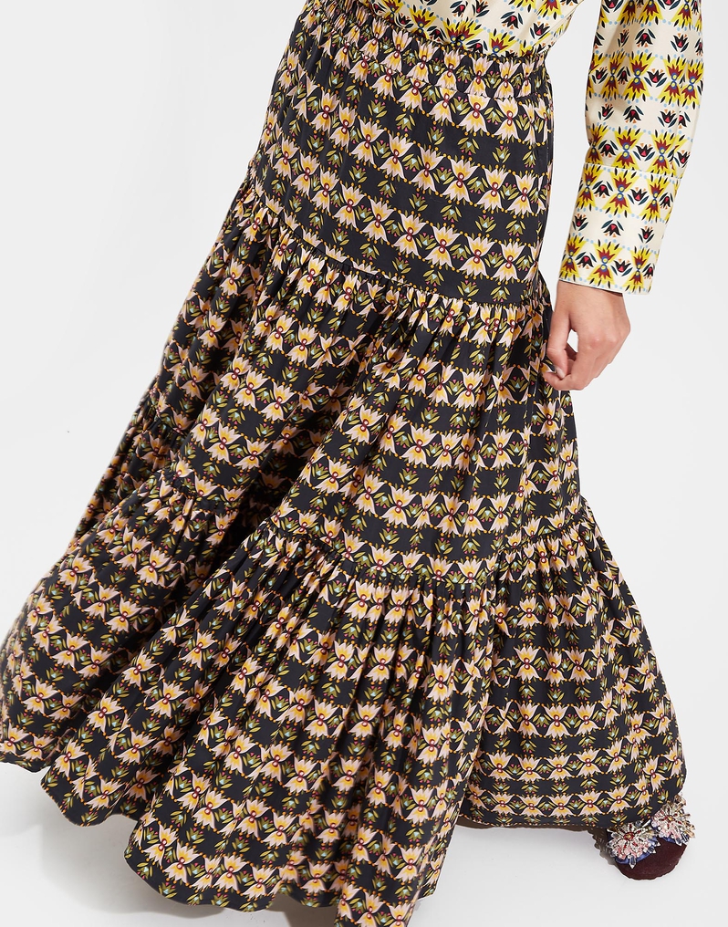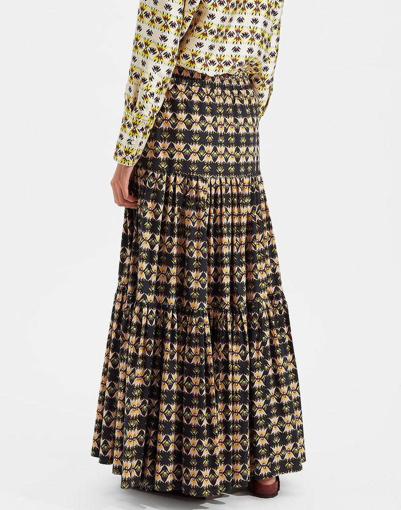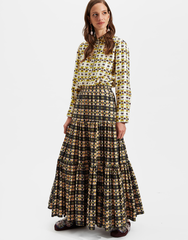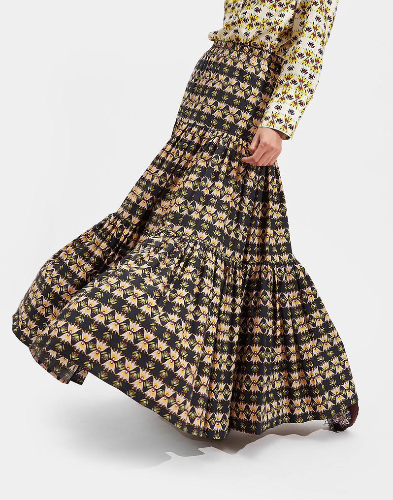 Made in comfy lightweight cotton voile, the Big Skirt’s voluminous tiers of printed fabric can take it from a casual outing to a major occasion moment in a snap. You can wear it up high as a strapless maxi dress (it looks great belted!) or traditionally at your waist or slung low on the hips. The mustard yellow and chocolate of the Bacetto print bring this skirt in line with fall’s natural landscape.
