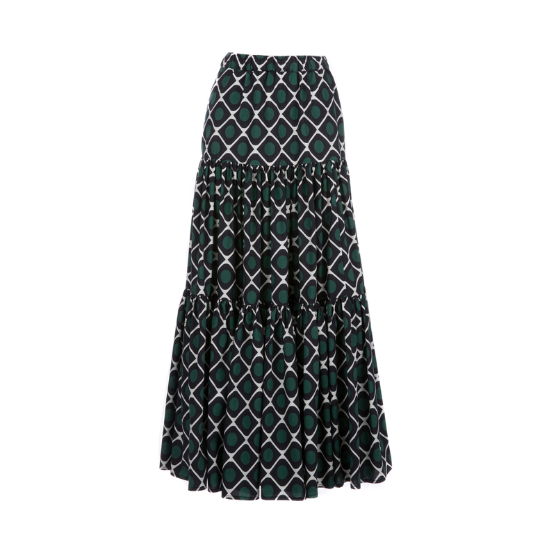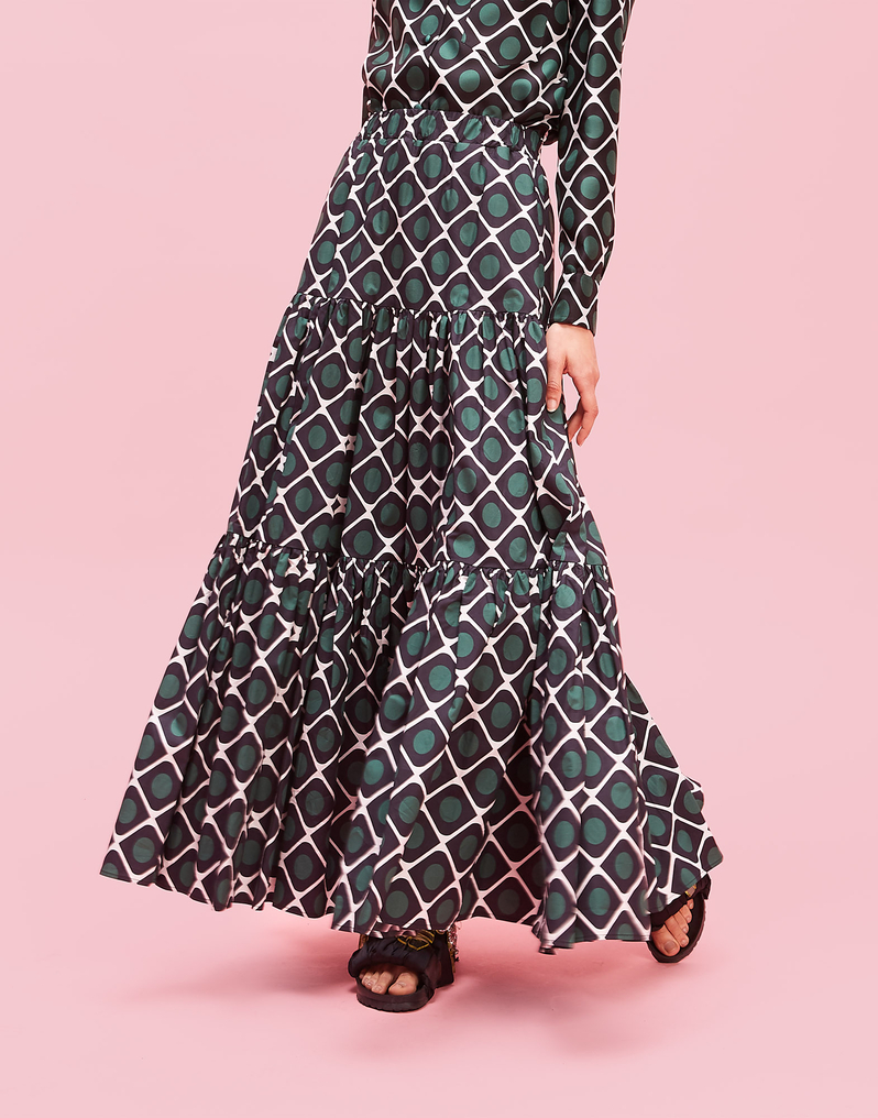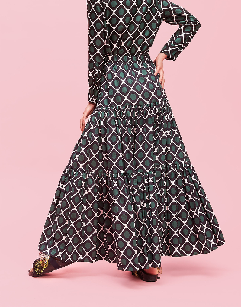 Our peasant comes in a lightweight cotton poplin, but the voluminous tiers of the printed fabric can take it from a casual outing to a major occasion-moment in a snap. The fit is relaxed and comfortable thanks to its elastic waist. You can wear it up high as a strapless maxi dress (it looks great belted!) or traditionally at your waist or slung down below the hips.