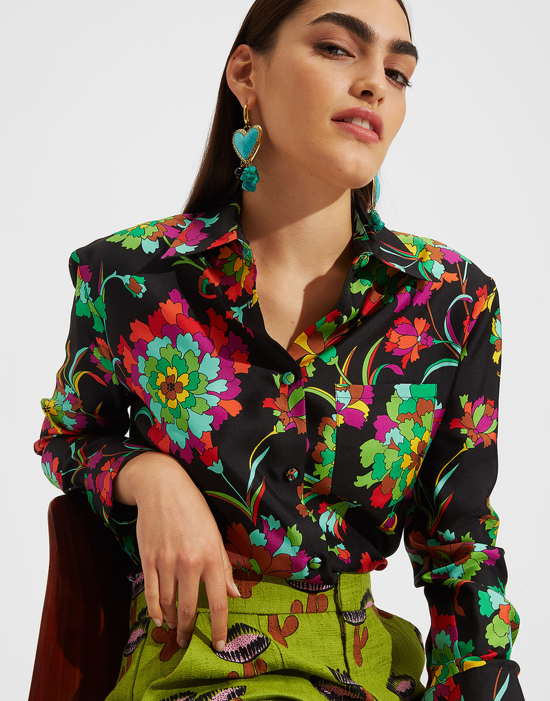 This classic, straight-cut button down silk shirt is timeless and matches virtually anything in your wardrobe. The fit is straight and feminine with slightly gathered sleeves that hit at the wrist.