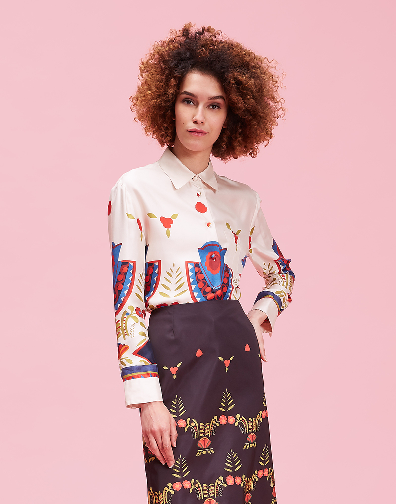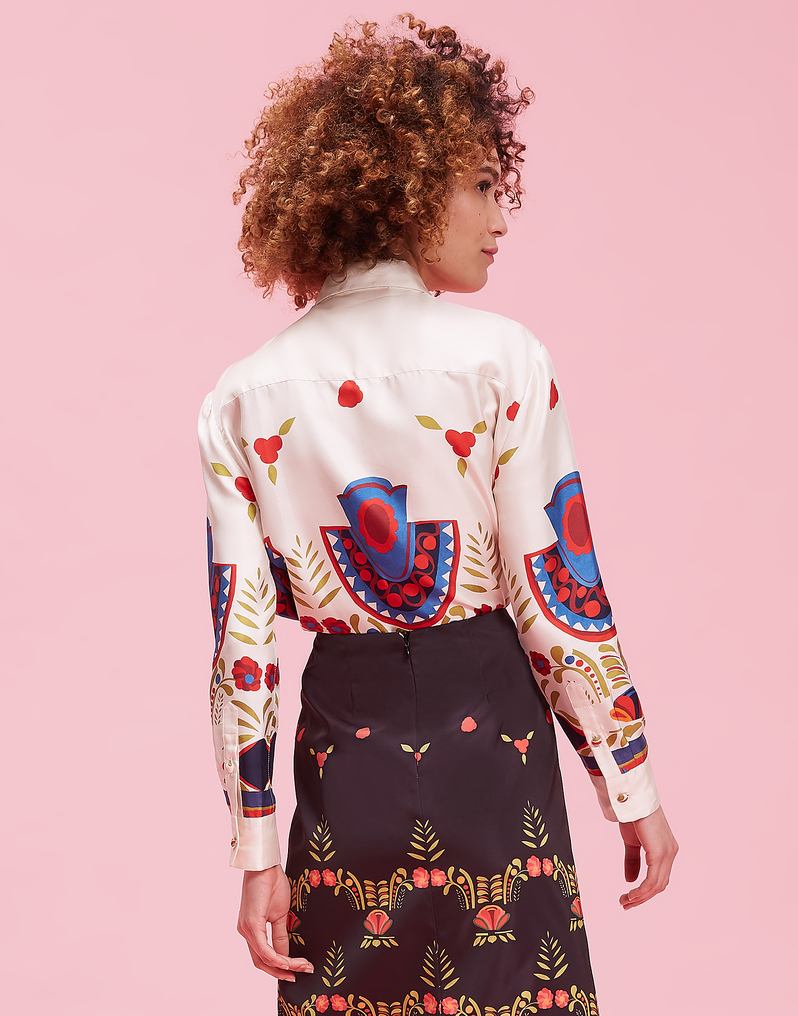This classic, straight-cut button down shirt is timeless and matches virtually anything in your wardrobe. The fit is straight and feminine with slightly gathered sleeves that hit at the wrist. This shirt is a LaDoubleJ Evergreen and can we be worn with its matching Skirt for a va-va-voom effect, or toned down with jeans or a simple skirt.