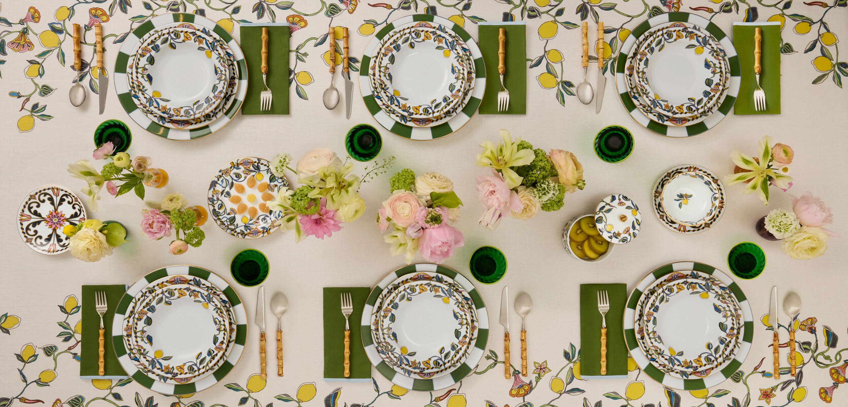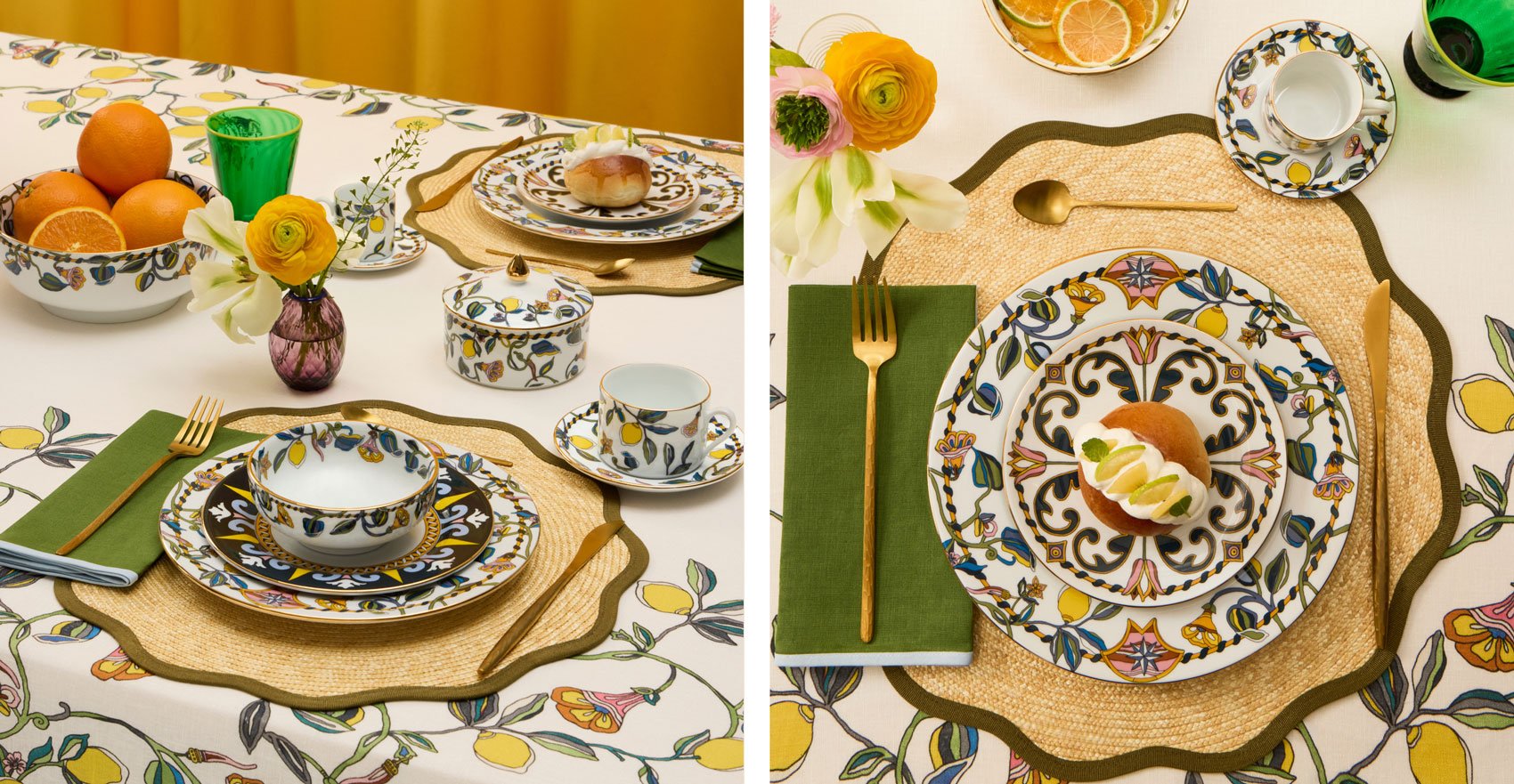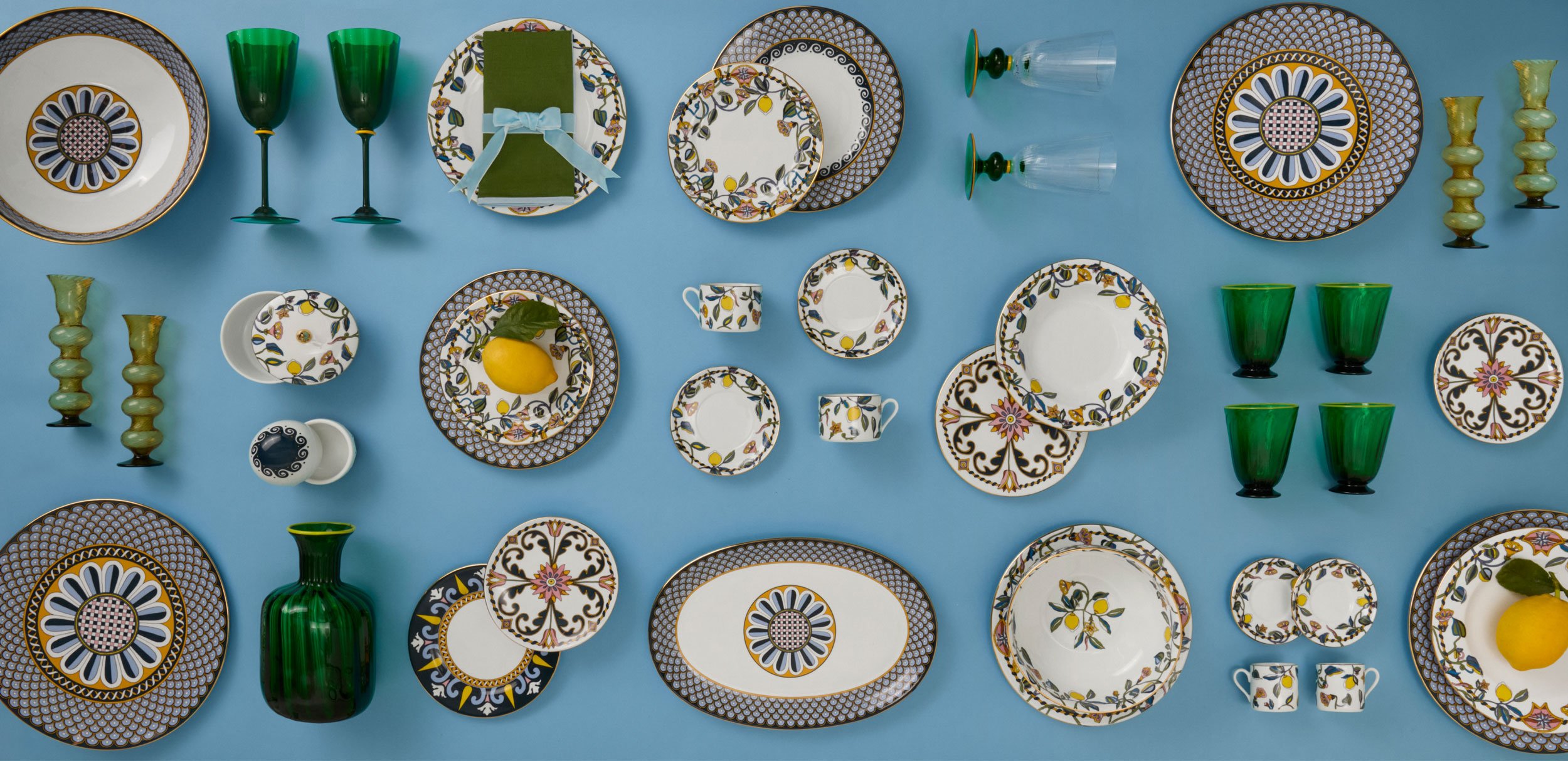 La DoubleJ enriches its Al Fresco offer with a complete tabletop collection inspired by the sunlit lemon orchards of the Tuscan hilltop town of Fiesole. Vibrating with bold colors, joyful prints, and the irresistible Italian dolce vita spirit, the porcelain collection honors the legacy of Florentine citrus - emblems of warmth, abundance, and timeless Mediterranean allure, and deeply prized by the Medicis. It makes a statement setting alone but has extra impact when paired with our straw placemats, striped table linens and colorful Murano Glassware for a truly al fresco aesthetic.